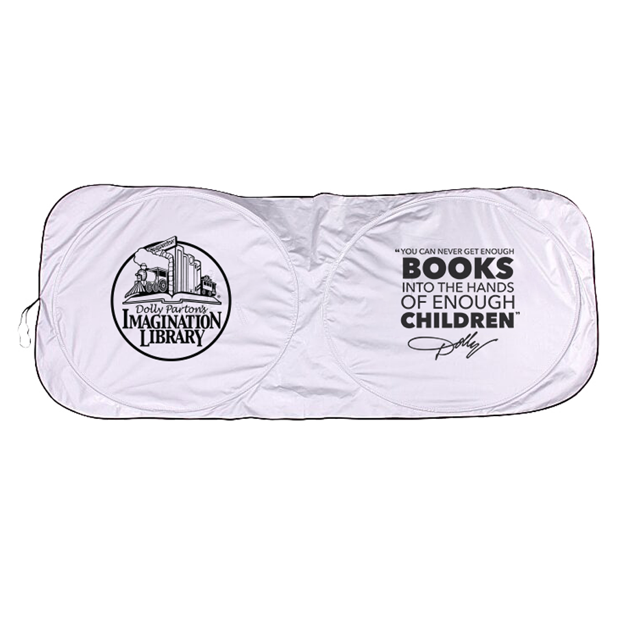 DPIL logo silver car shade with “Never Enough Books” Dolly Quote